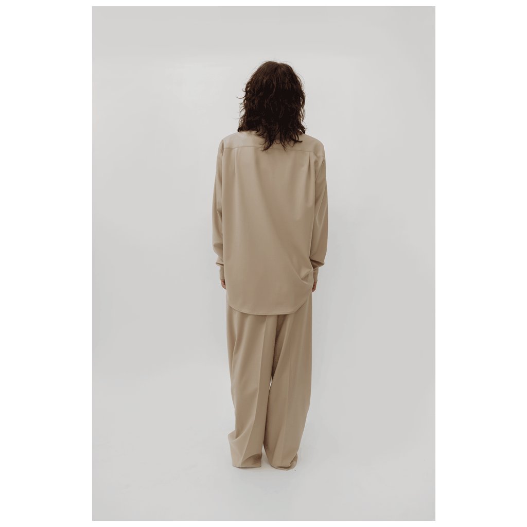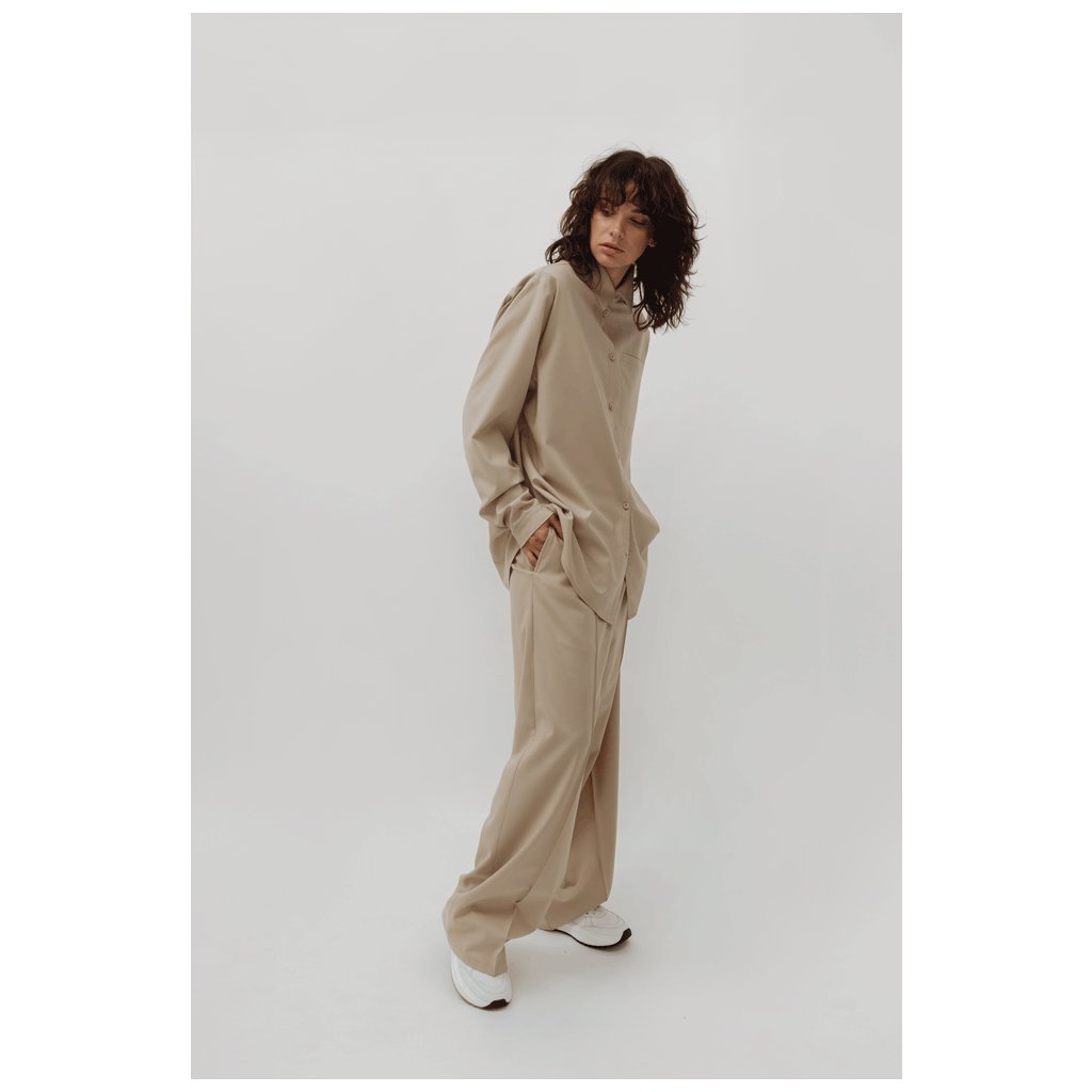 Béžový komplet sestaven z oversize košile s rukávy, které vytvoří zajímavý nabíraný efekt a širokými kalhotami s puky. 100% bavlna.
